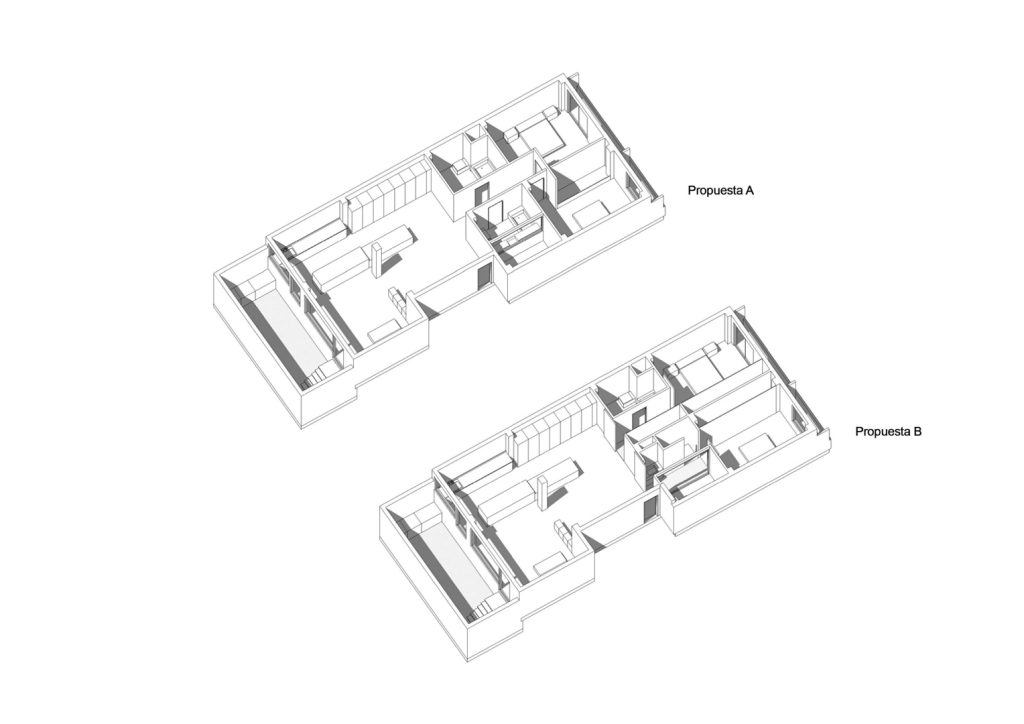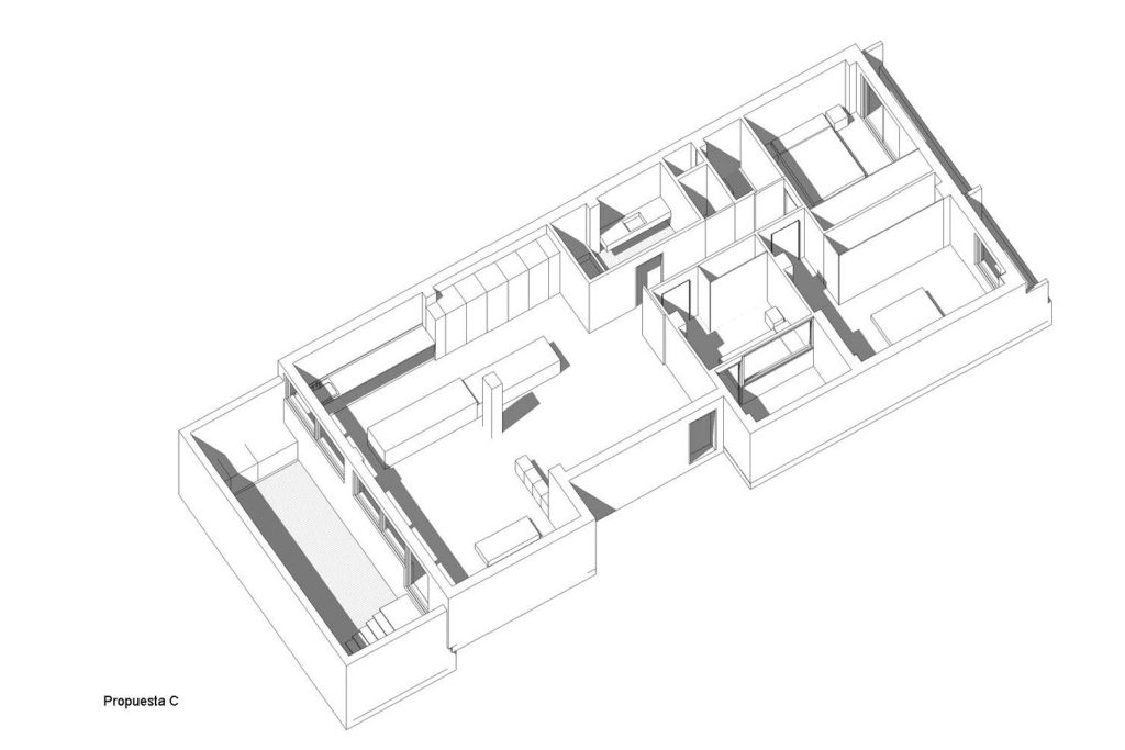 Tras el estudio de las posibilidades que ofrecía la vivienda se llegó a varias soluciones. Fruto del trabajo del estudio y el cliente se ha ido trabajando en las necesidades y en lograr una futura vivienda que dé cabida a todas ellas