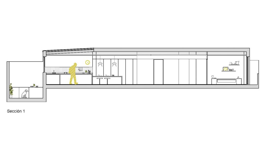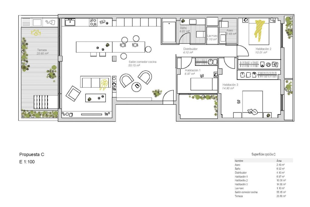 El proyecto finalmente adopta la opción C, una solución adaptada a las necesidades del cliente, y que mantiene la relación de la zona de día. Para mejorar las prestaciones térmicas de la vivienda, el contorno se reforzará con un sistema de trasdosado de aislamiento+pladur, así como con la mejora de las ventanas. La cubierta que se retira se sustituirá por una cubierta de panel sándwich sobre unos perfiles metálicos, teniendo especial cuidado en resolver las filtraciones existentes.