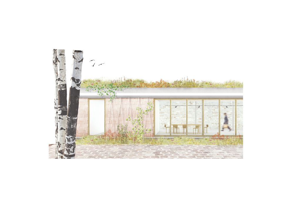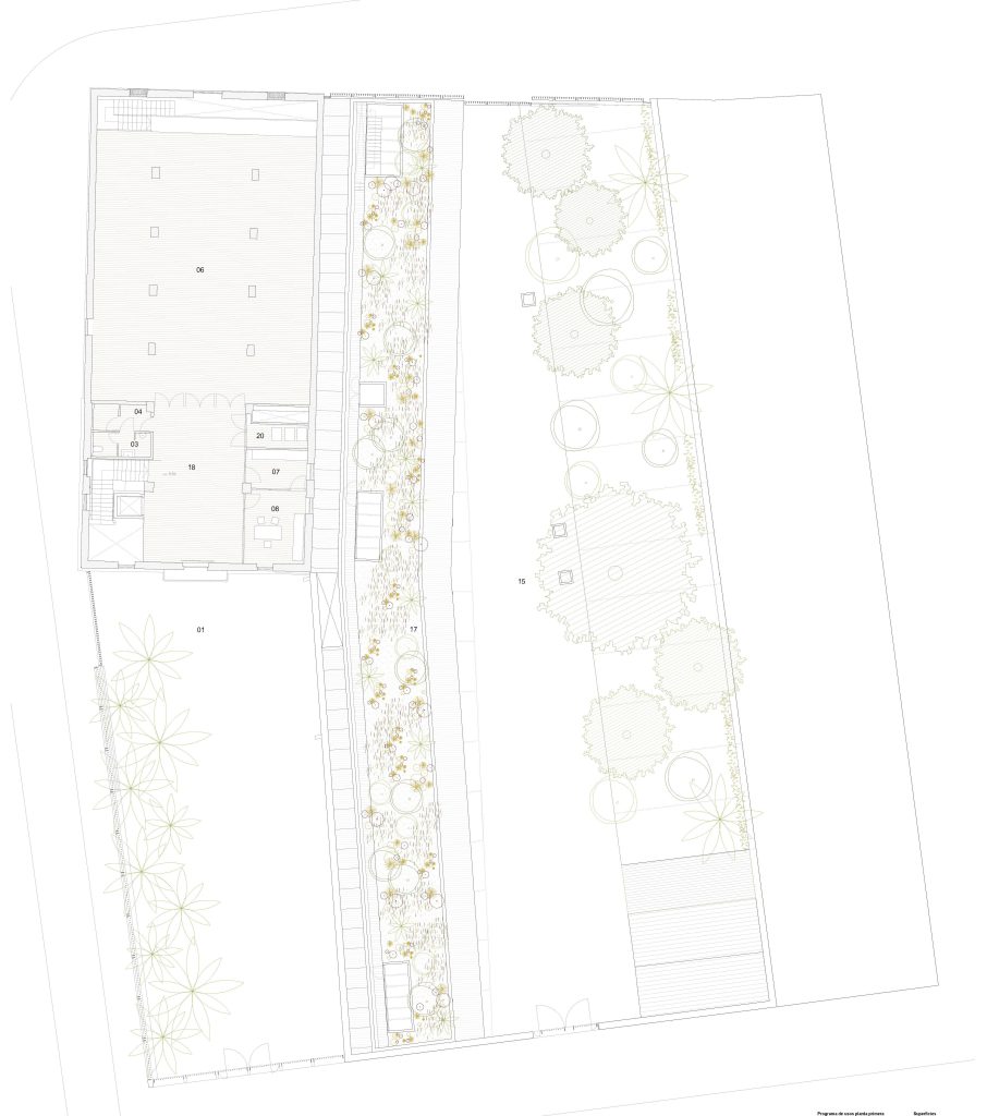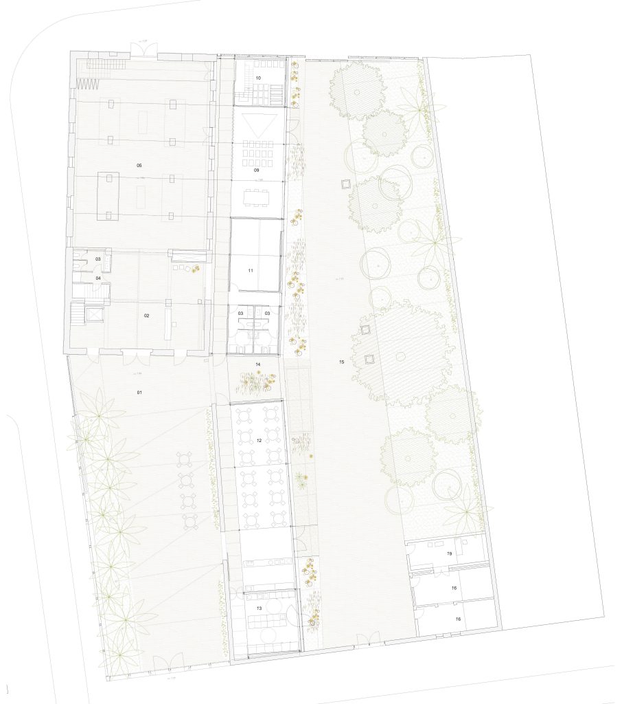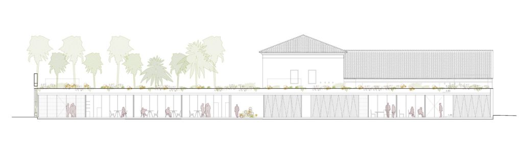 La Casa dels Bous, en la medianera norte hacia Tenyidors, se resuelve con un nuevo edificio abierto al jardín, de uso sociocultural y gastronómico, que conecta a modo de umbral los distintos edificios, espacios públicos, el Pati dels Bous y el jardín de Tenyidors.