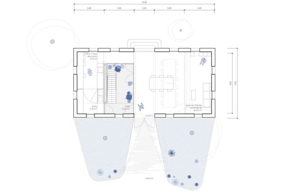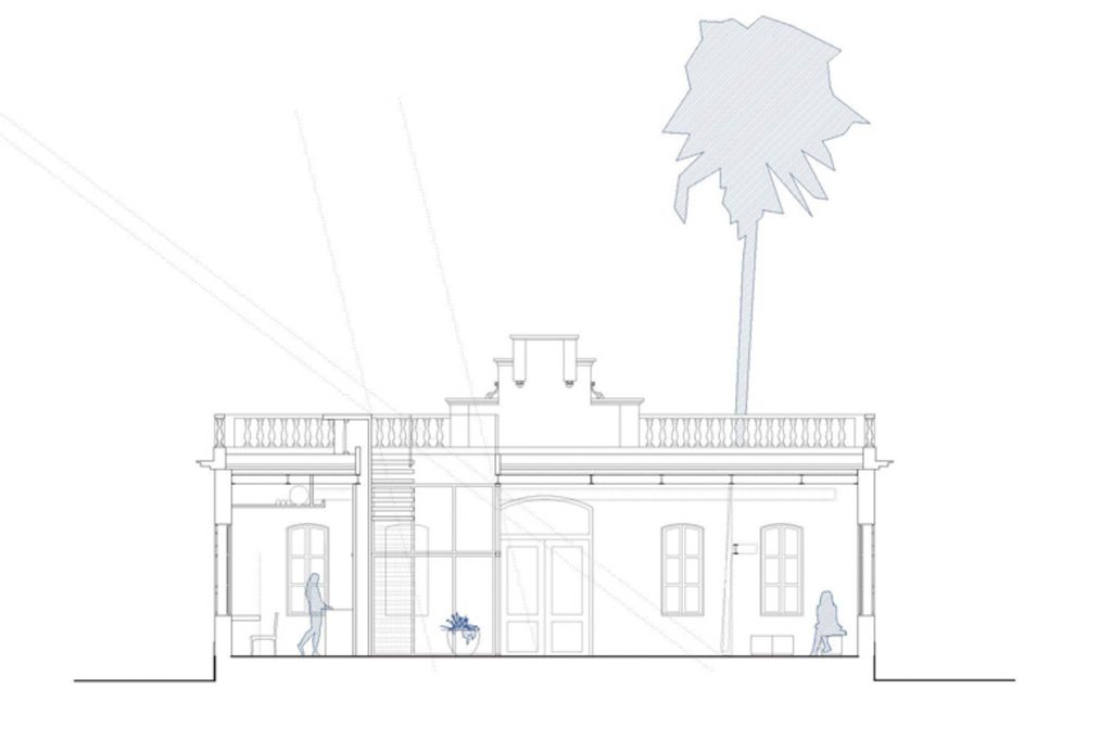 En lo que respecta a la intervención arquitectónica, nuestra prioridad ha sido la de proteger y restaurar la fachada, transformando su interior en un espacio diáfano, abierto a la luz natural. El resultado ha sido una atmósfera en la que la luz mediterránea es la protagonista absoluta. Este espacio flexible, se ilumina desde un patio central que separa el espacio de trabajo del espacio de vida del artista. Desde el patio es posible acceder a la cubierta, está destinada a albergar una gran variedad de eventos desde un enclave privilegiado con vistas al puerto.