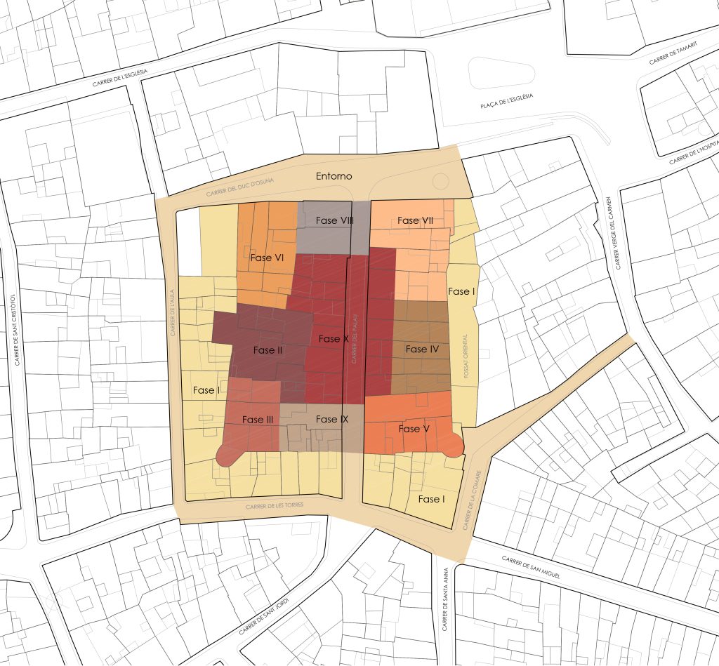 Localización: Calle Palacio, Calle Aula, Calle Torres, Calle de la Comare y Calle Duque de Osuna. Oliva, Valencia.