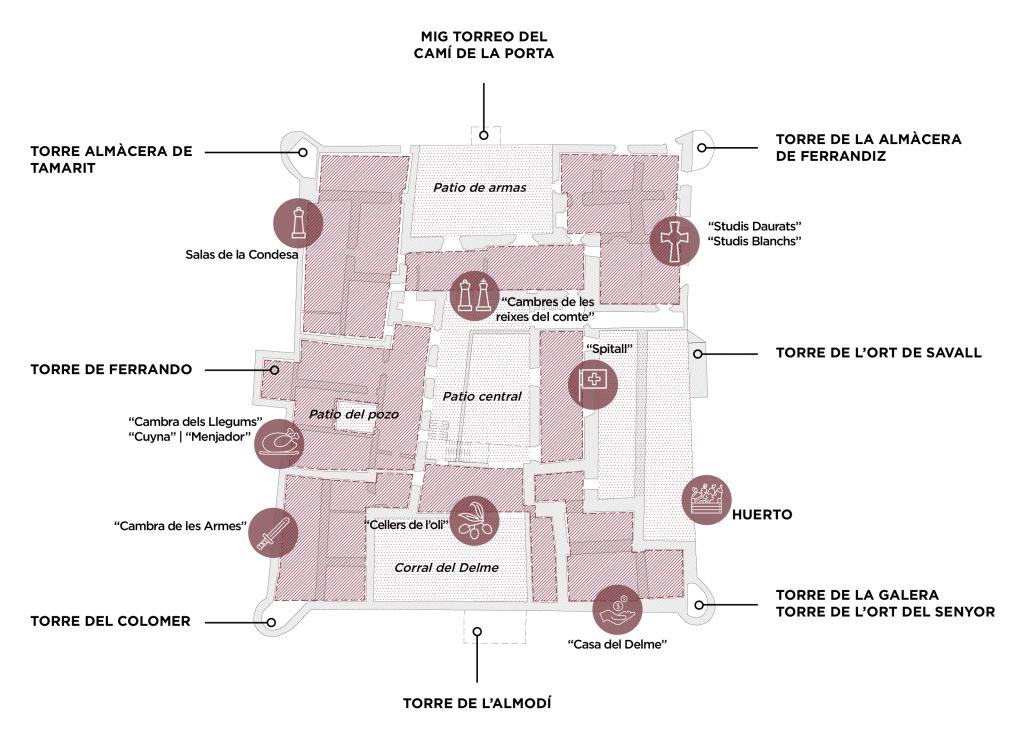 A través del estudio de la extensa documentación, tanto gráfica como escrita, elaborada por los diferentes inventarios históricos sobre los bienes y espacios del Palau, y de la documentación, gráfica y fotográfica, elaborada por unos arquitectos daneses que a principios del siglo XX intentaron ponerlo en valor y posteriormente desmontarlo para llevarlo a Dinamarca, se realizan distintas hipótesis y estudios para su comprensión constructiva y la localización de los restos, con levantamientos casa por casa, estancia por estancia.